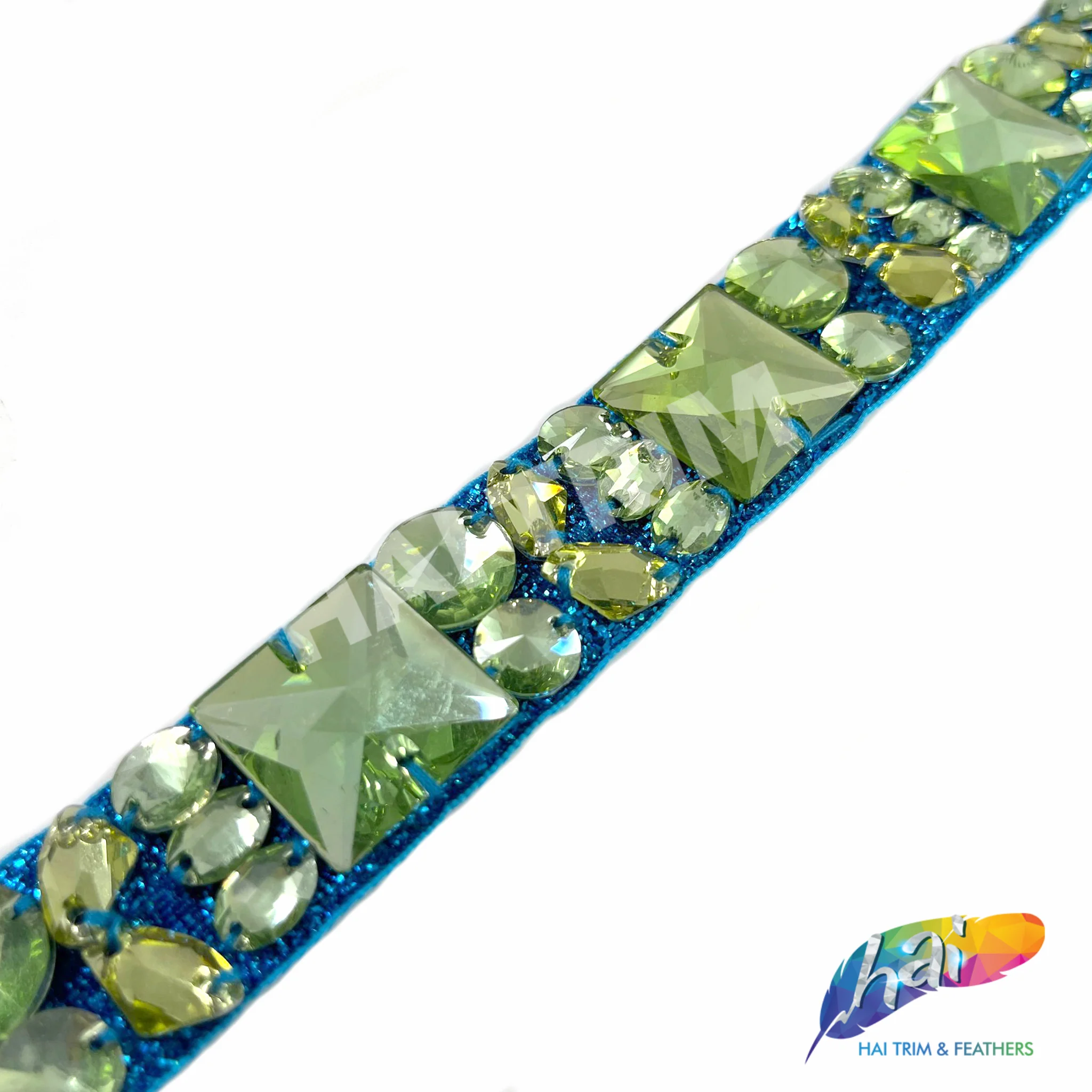 Colorful beaded trim made of resin acrylic stones sewn on glitter fabric tape. The biggest stone on this trim is a 22x22 mm square stones with small oval, round, and irregular stones in between.
