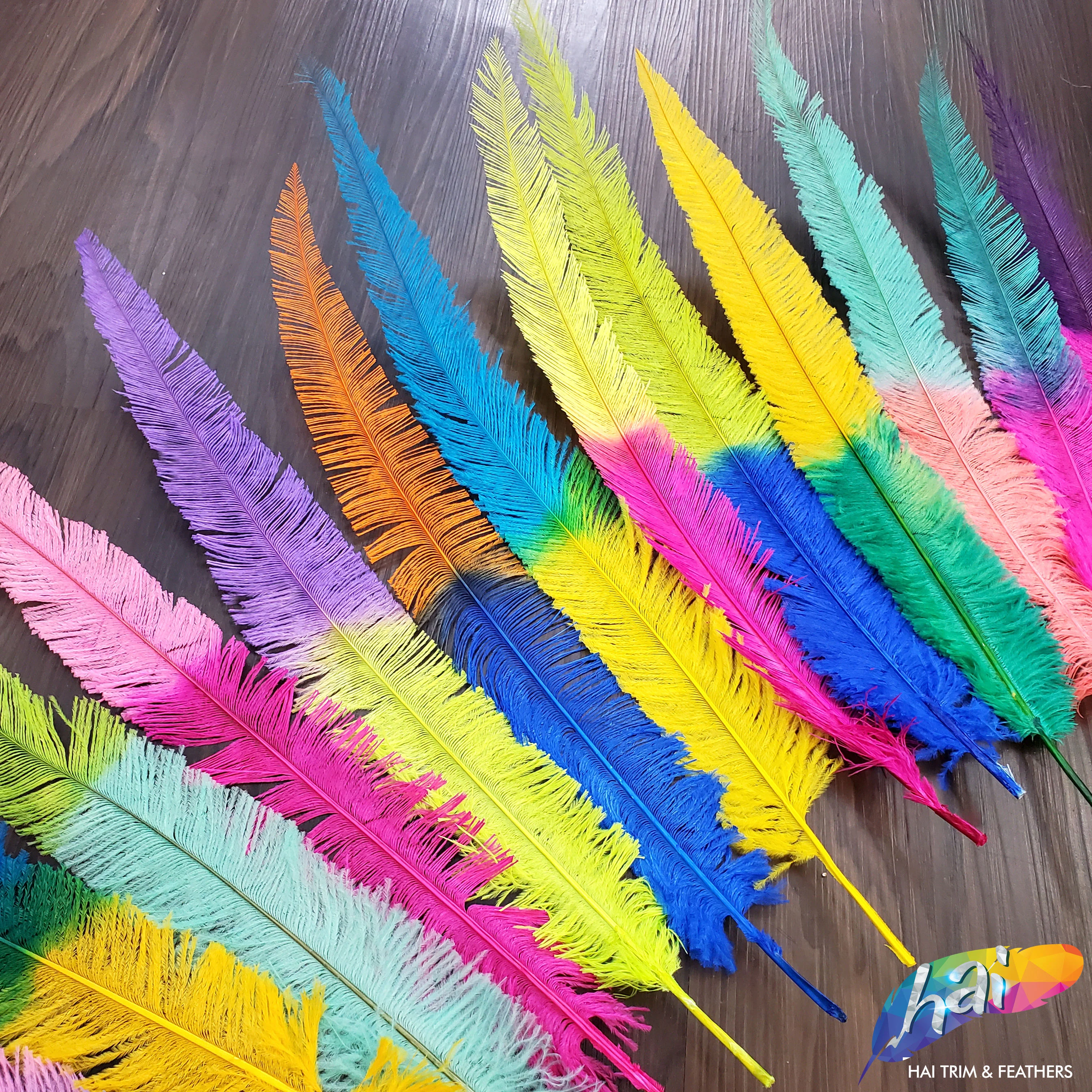 18-20" bleached dyed two tone nandu ostrich feathers. These ombre trimmed nandu feathers are mostly used for designing hats, carnival costumes, headpieces, feather backpacks, or any other costume projects.