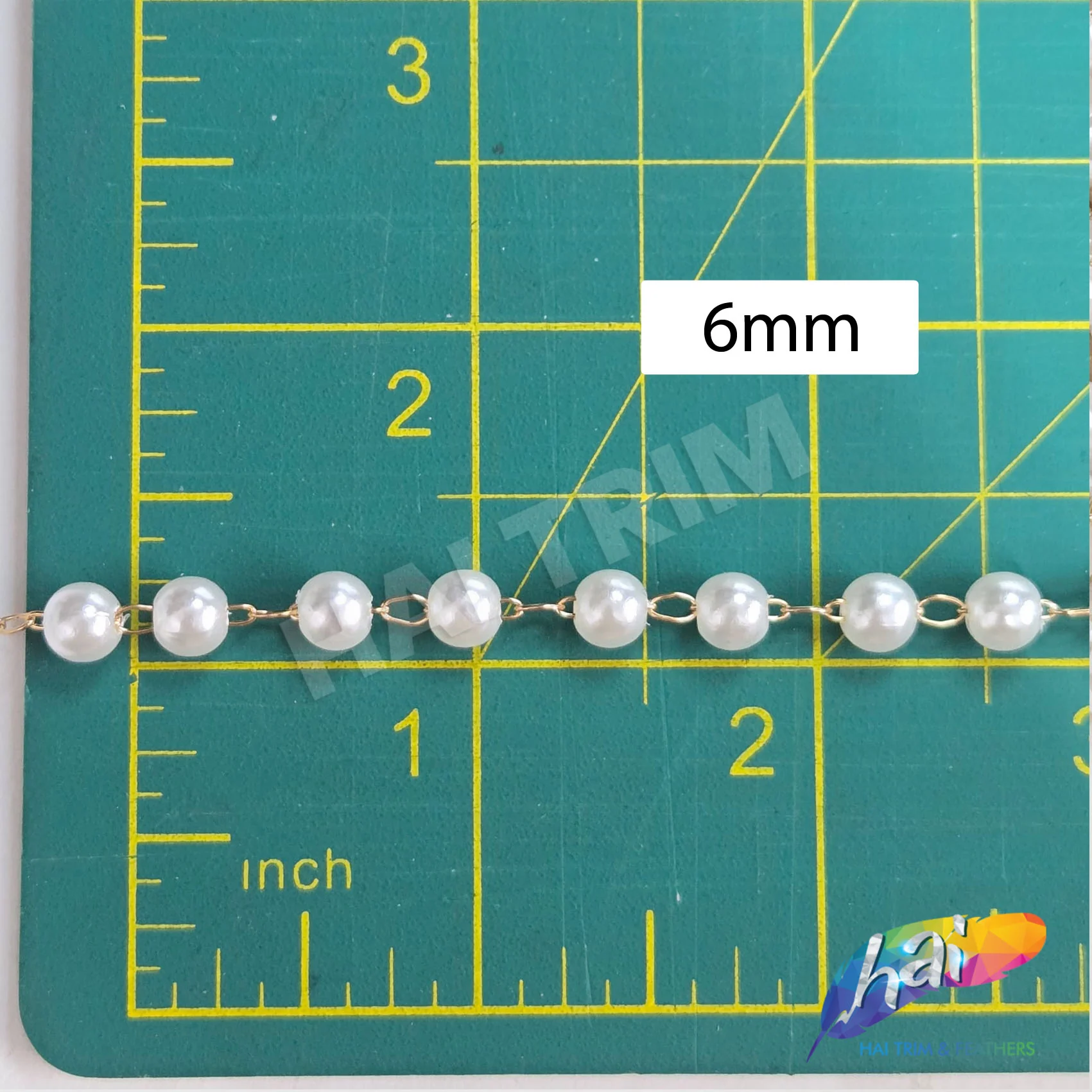 Lightweight pearl trim made with 6 millimeter white pearl beads connected by gold or silver chain links. Perfect for wedding or formal occasions, accessories, and a lot more. Can be cut into smaller pieces or strips using pliers or heavy duty scissors.