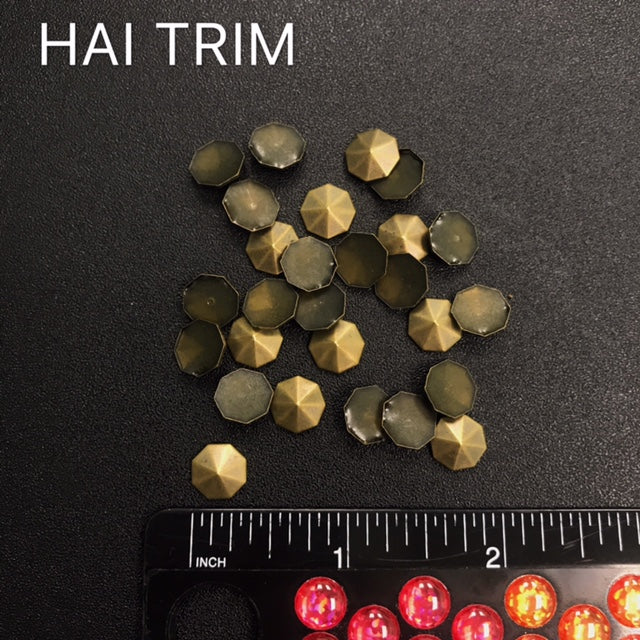 Loose metallic iron on hexagon studs. Perfect for jackets, denim, shoes, and a lot more. These studs have glue on the back which can be ironed using a hotfix applicator or a regular iron (medium heat) with a damped cloth. They can be glued as well using any type of glue preferably suitable for jewels or beads.