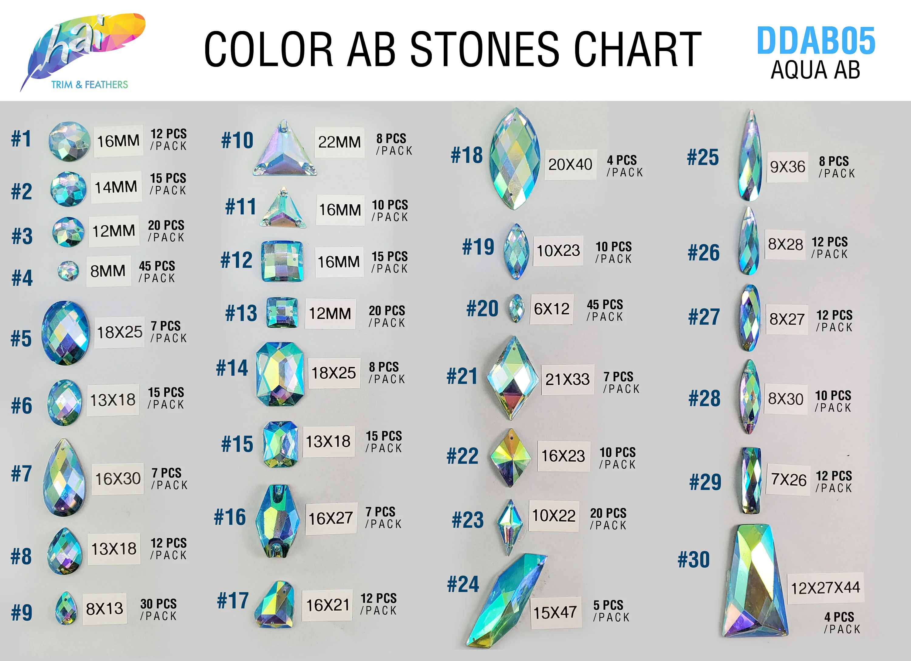 Aqua AB Iridescent resin stones in 30 different shapes. Each stone has two holes on the side for sewing. It can be glued as well using E6000 or any type of glue.
