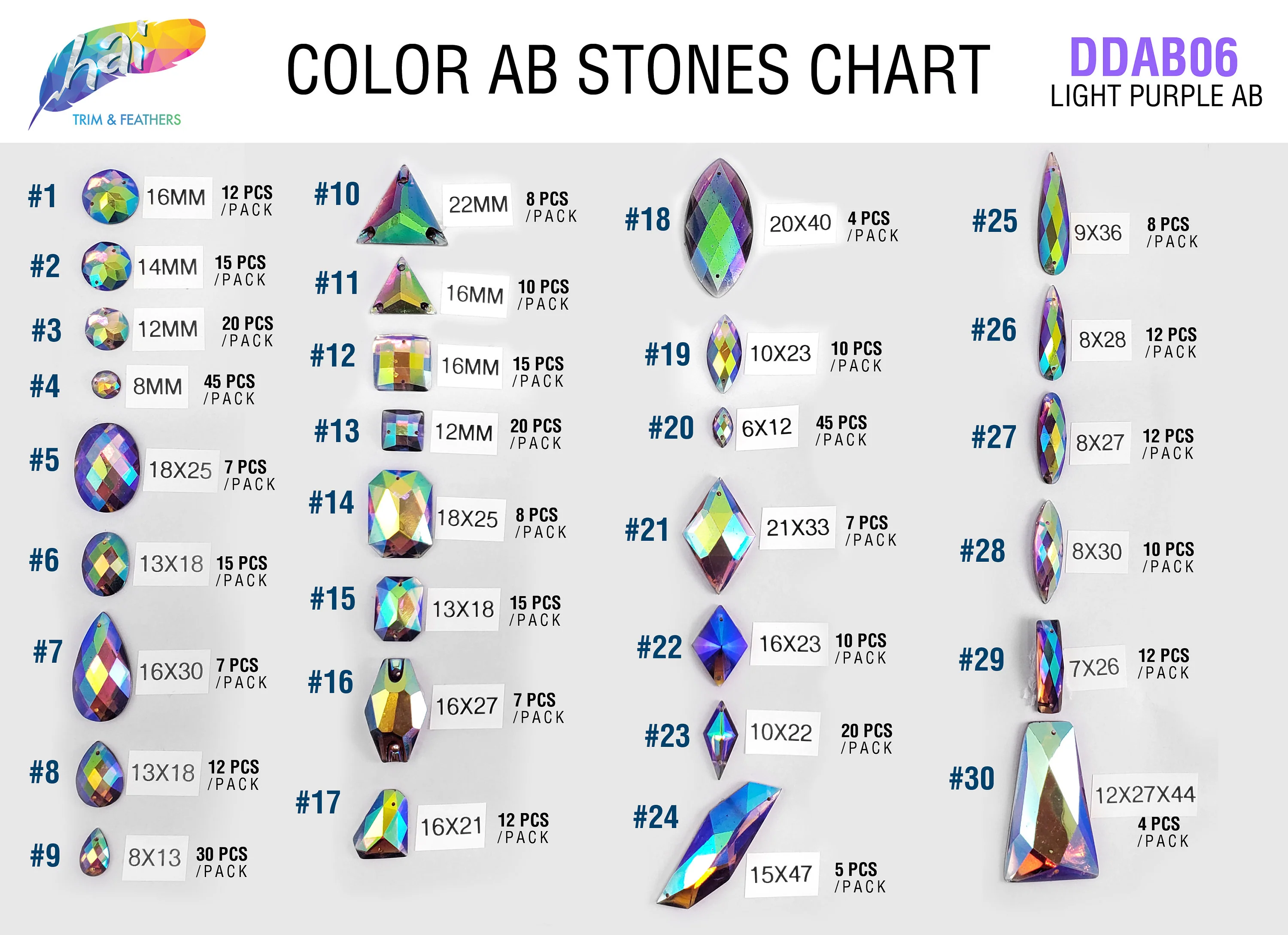 Light Purple AB/Light Amethyst AB Iridescent resin stones in 30 different shapes. Each stone has two holes on the side for sewing. It can be glued as well using E6000 or any type of glue.