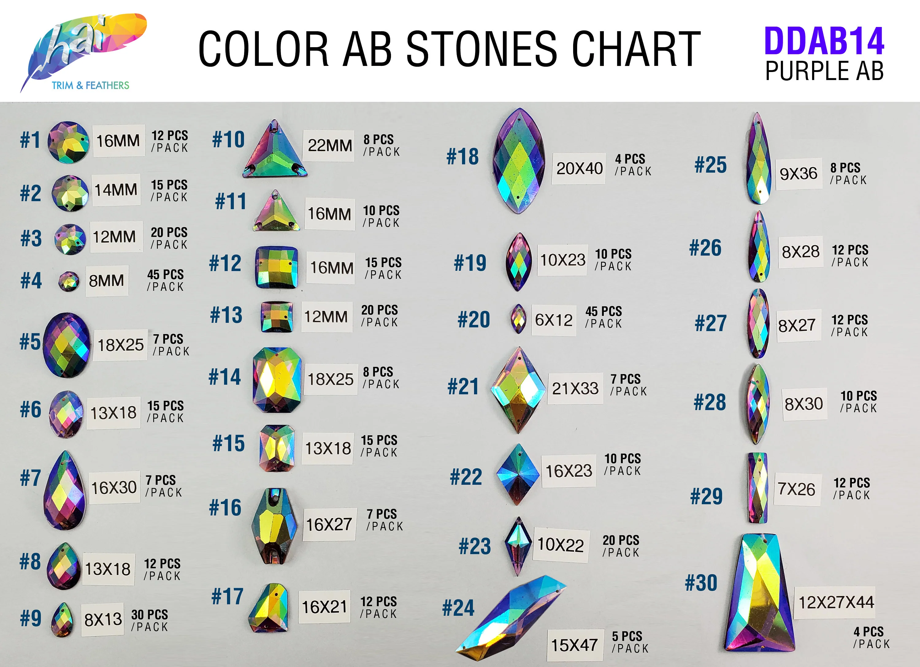 Purple AB Iridescent resin stones in 30 different shapes. Each stone has two holes on the side for sewing. It can be glued as well using E6000 or any type of glue.
