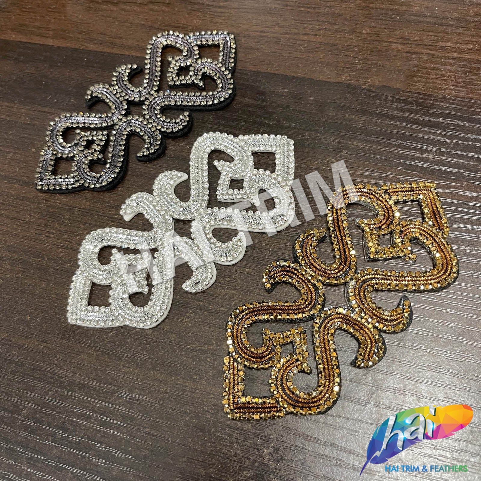 Stunning rhinestone applique made rhinestone cupchain trim and bullion trim strips in an exquisite design pattern. The materials are glued on a thin foam/felt backing.