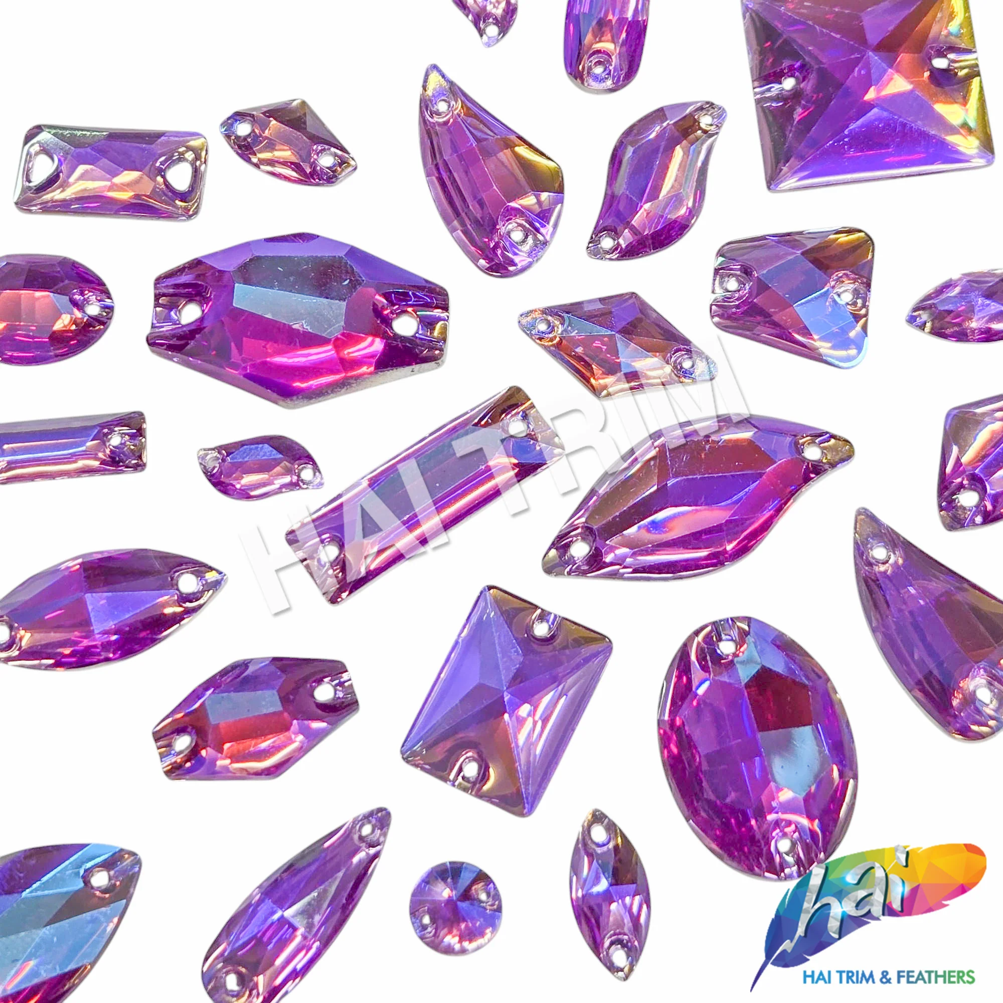 Bedazzling color iridescent stones in gel resin material in 34 different shapes and sizes. These stones have a lighter AB (iridescent) coating and has a more translucent finish. Each stone has two holes on the side for sewing. It can be glued as well using E6000 or any type of glue.