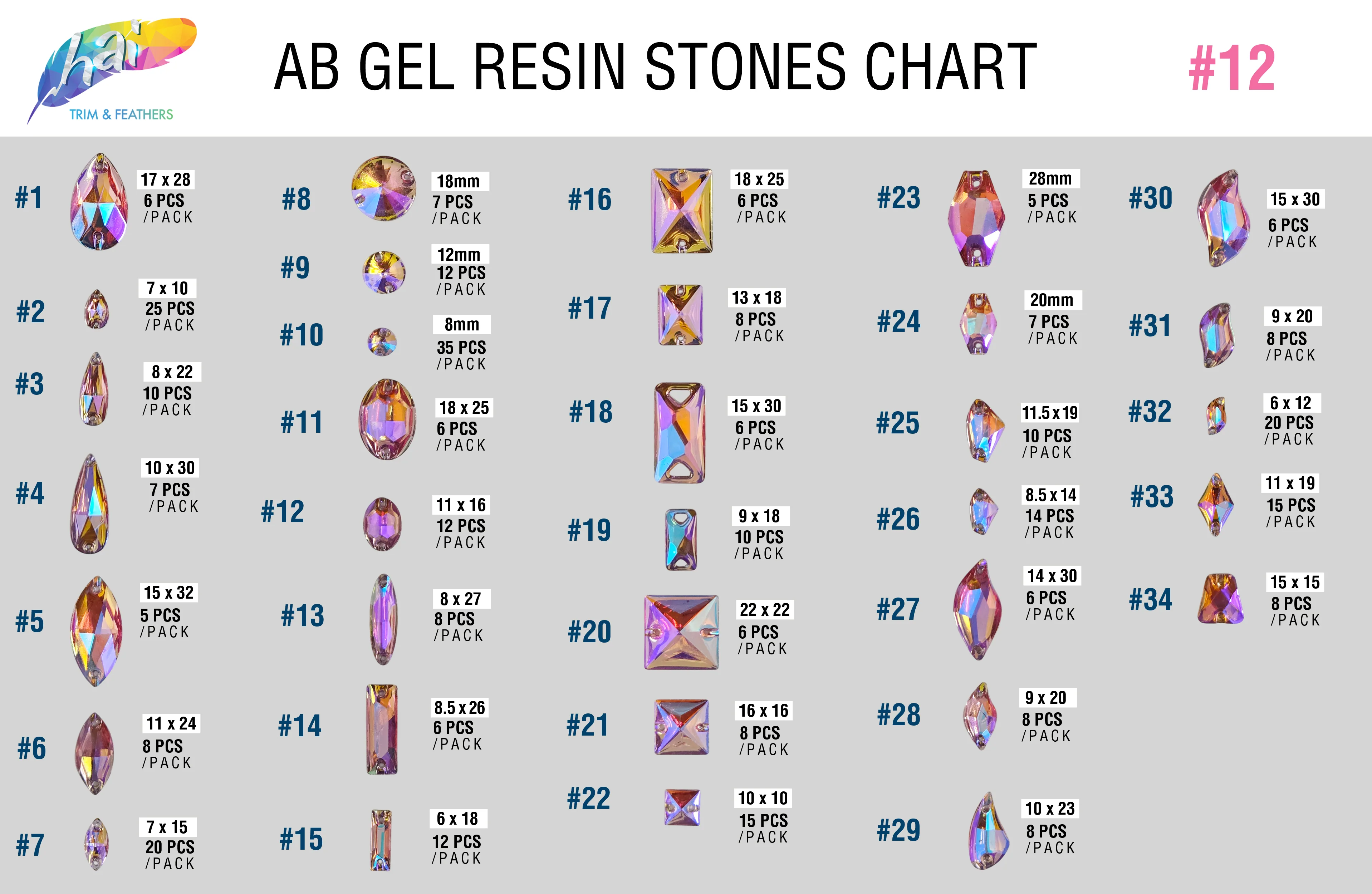 Bedazzling color iridescent stones in gel resin material in 34 different shapes and sizes. These stones have a lighter AB (iridescent) coating and has a more translucent finish. Each stone has two holes on the side for sewing. It can be glued as well using E6000 or any type of glue.