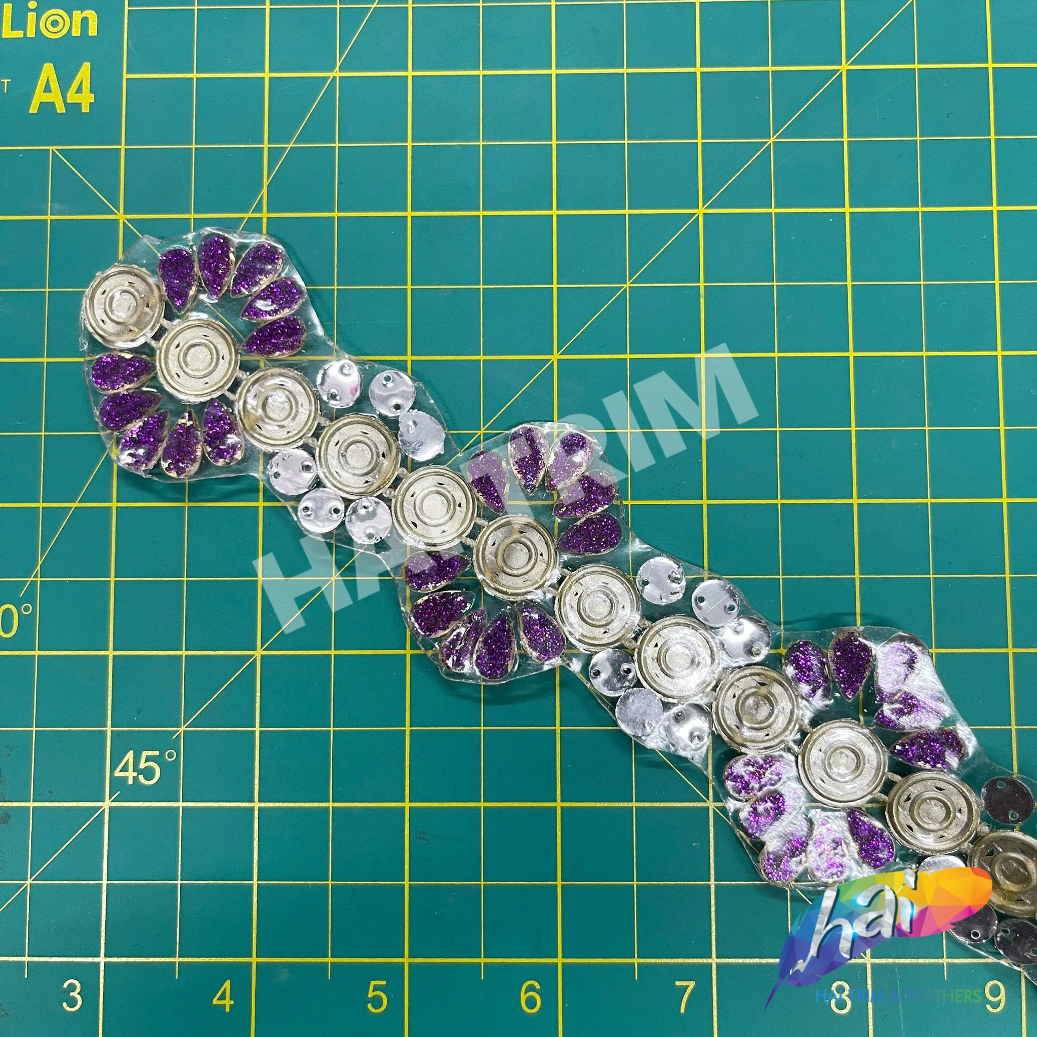This is part of our best-selling collection, the Iron-on Trimmings. This flower trim is made of premium quality resin/acrylic stones with beautiful plastic gold trimming in the middle. The materials are attached to a transparent gel-back film which can be ironed! It can be cut into smaller pieces using regular scissors.