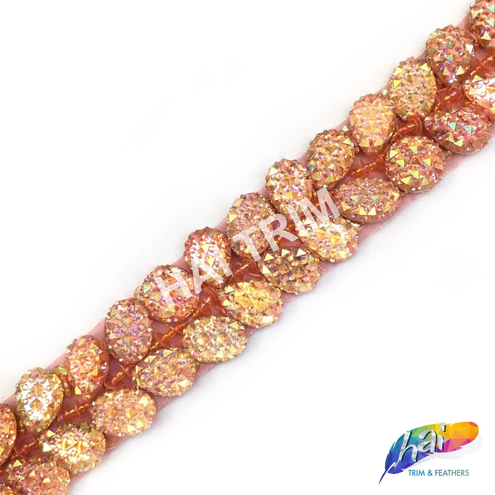 This is a 2-row stone trimming for dance, Broadway, carnival, and other costume projects. This trim is made of beautiful resin colored stones with a textured finish sewn on mesh fabric.