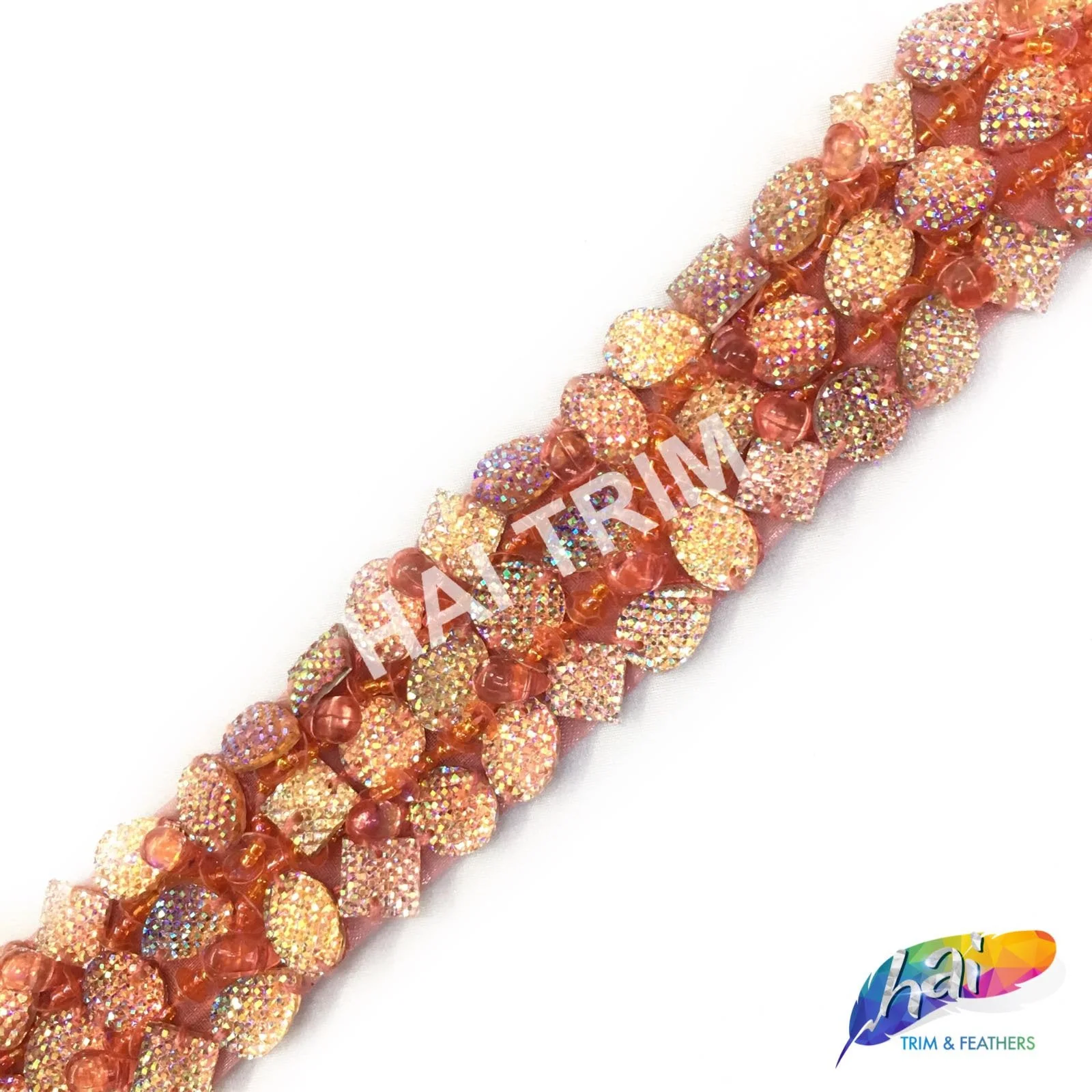 This is a 3-row stone trimming for dance, Broadway, carnival, and other costume projects. This trim is made of beautiful resin colored stones with a textured finish, sewn on mesh fabric.